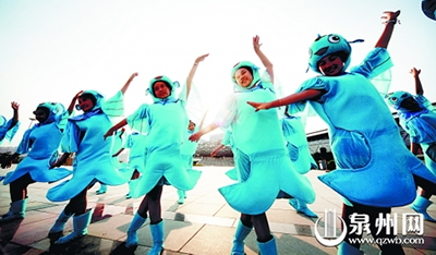 昨日,在海峡体育中心,参加中国航海日庆祝大会文艺演出的演员们正在抓紧排练。 (张九强 摄)